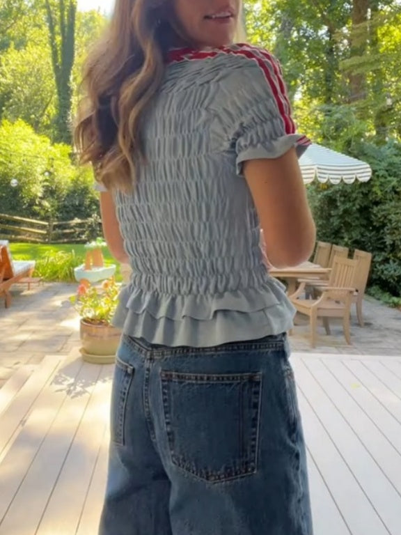 - Red and white seam detail across the shoulder