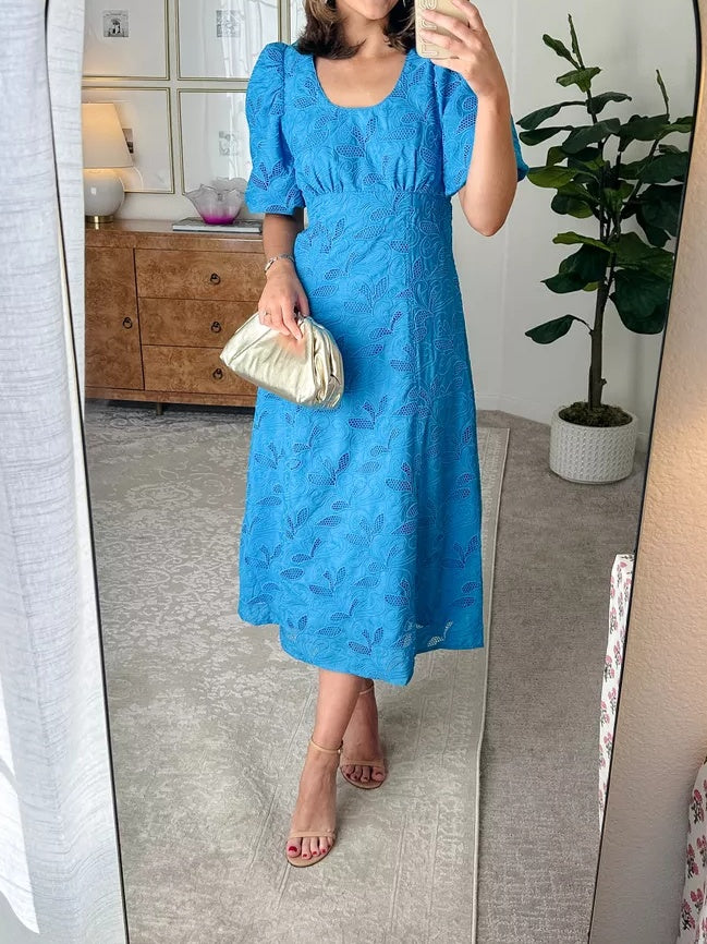 The Azure Lace Midi Dress is a flattering style with short puff sleeves, an empire waist, and a romantic lace construction. The vibrant blue transports us to a sunny day- just add colorful earrings and heels for a sunny ensemble!