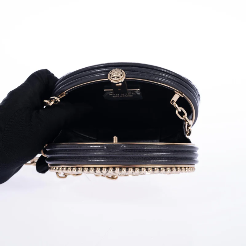 Detailed with both aged palladium and gold-tone accents, the bag is adorned with fringe trim and a signature belt buckle-shaped clasp. Dual zip closures open to a black grosgrain-lined interior, featuring a main compartment and a zip pocket for essentials. The leather-woven chain strap offers effortless wear, whether crossbody or over the shoulder. Measuring approximately 23 x 18 x 2 cm, this minaudière is a rare and storied addition to any connoisseur’s wardrobe, complete with its original box.