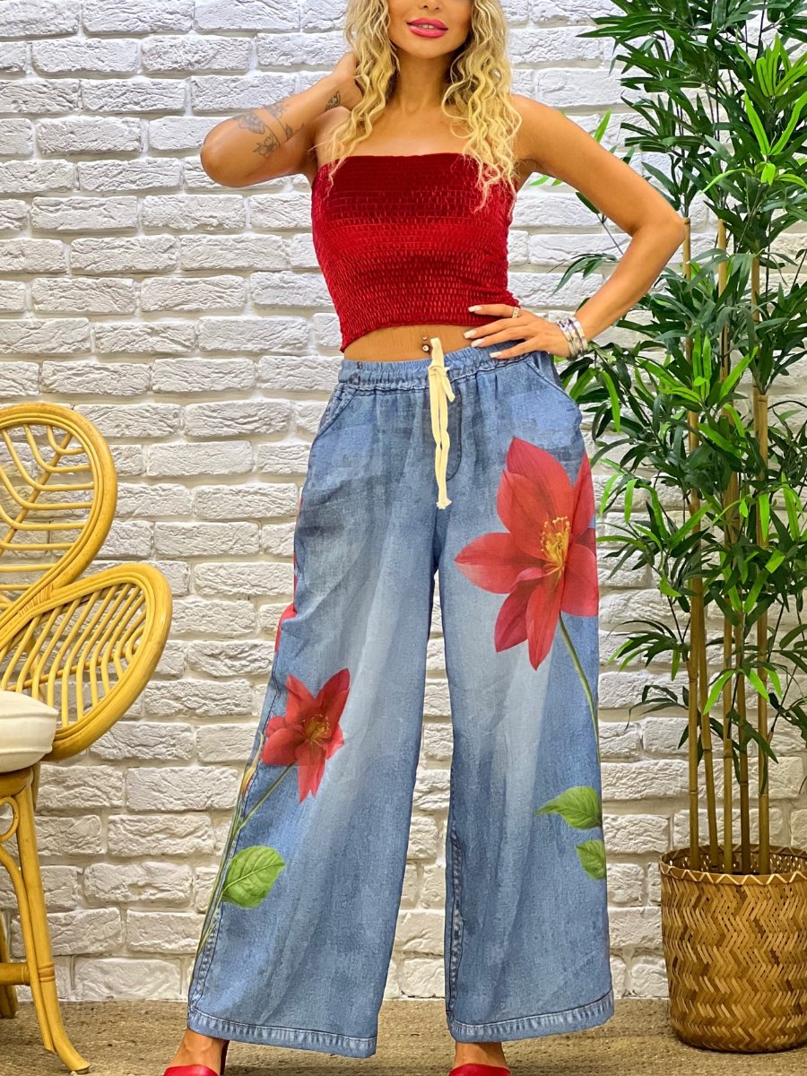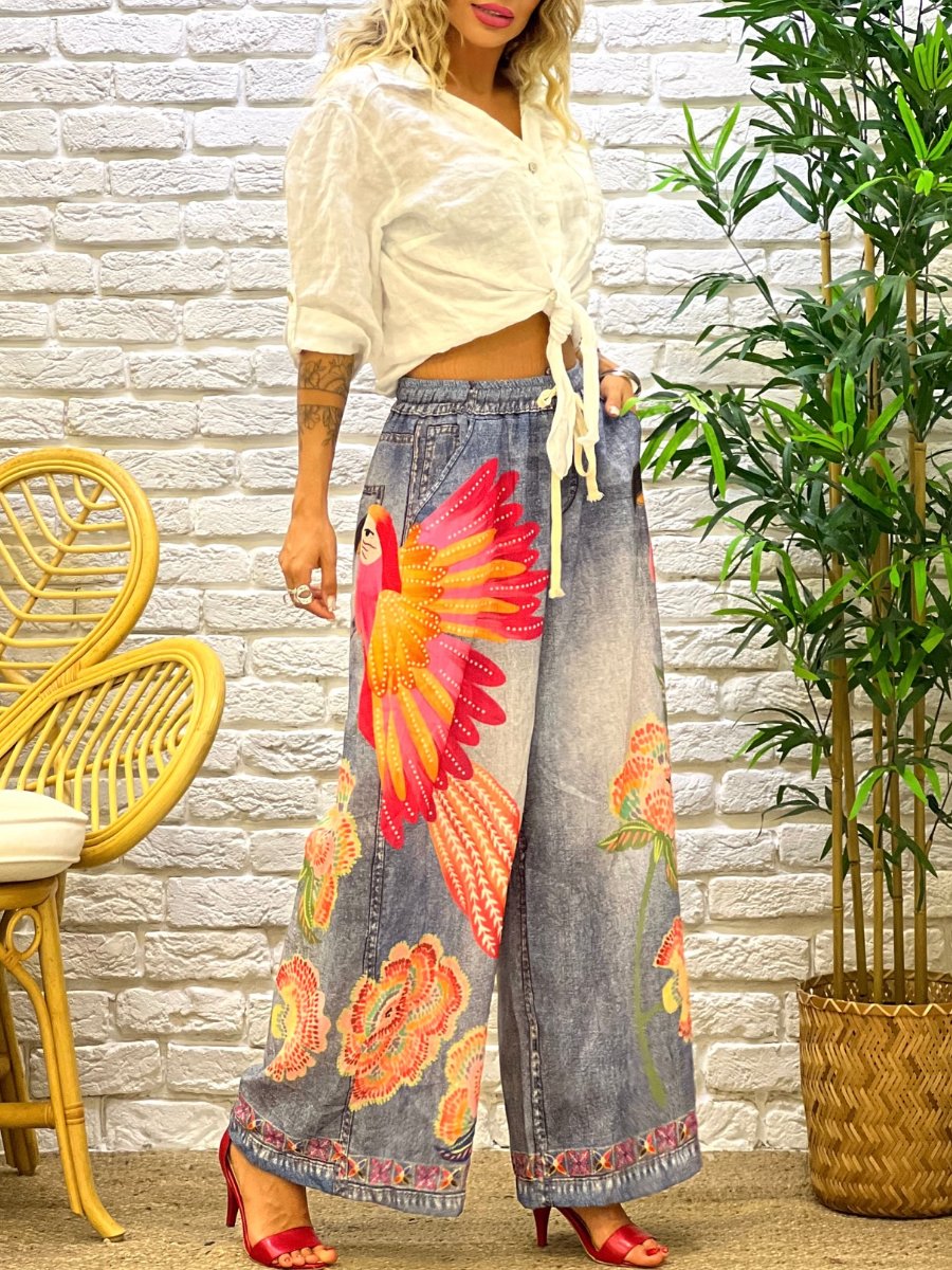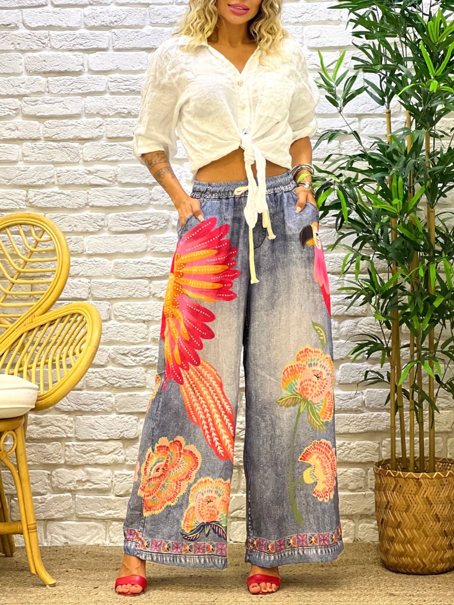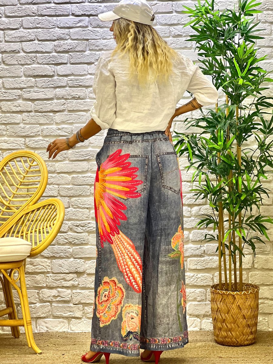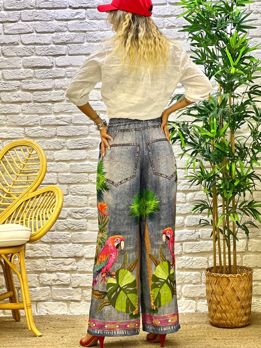 Boost your wardrobe with a unique twist, these PRINT DENIM TROUSERS feature fun and eye-catching prints. Made from high-quality denim, these trousers are comfortable and stylish, perfect for any occasion. Stand out from the crowd and express your personality with these statement trousers.